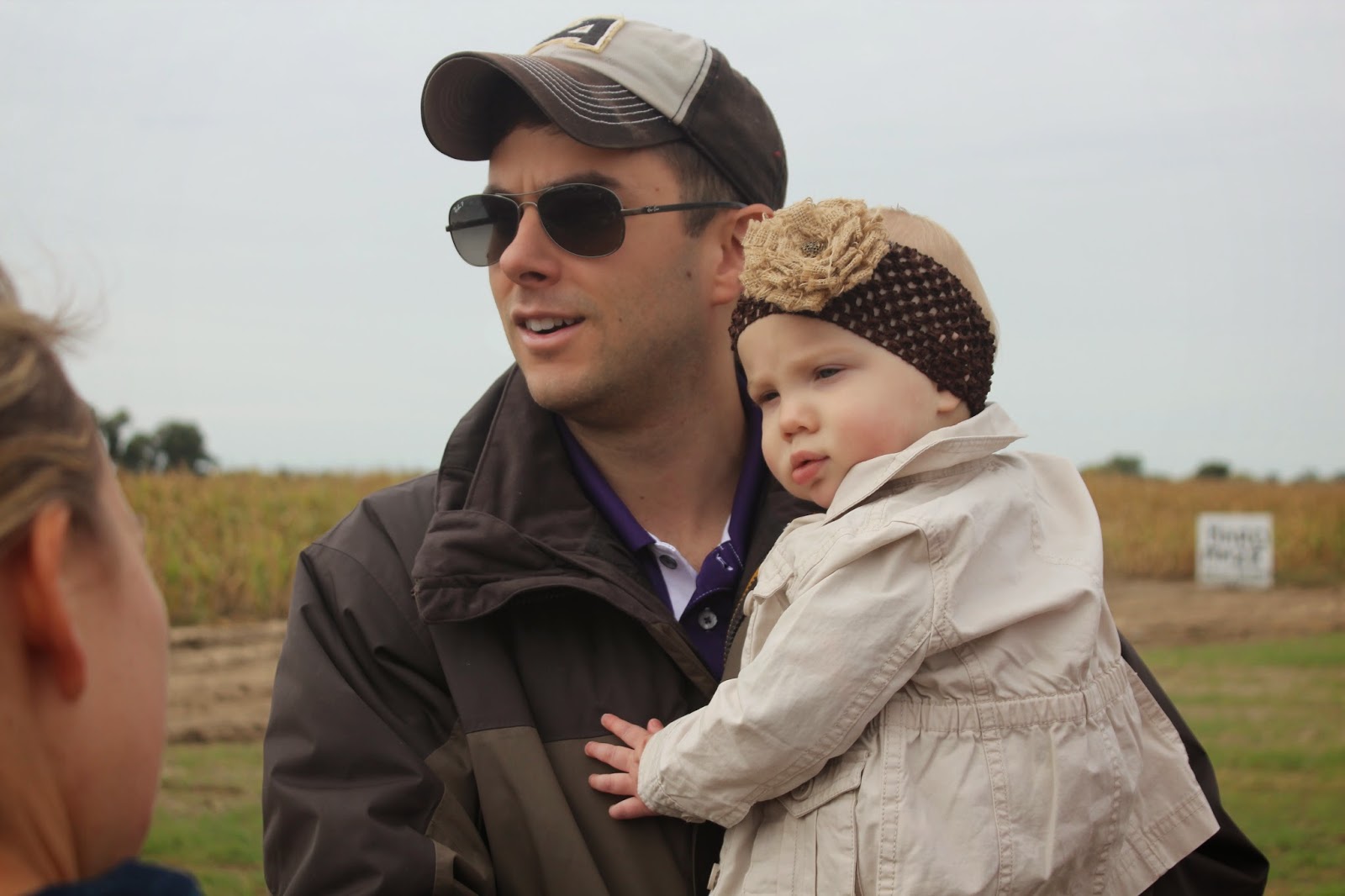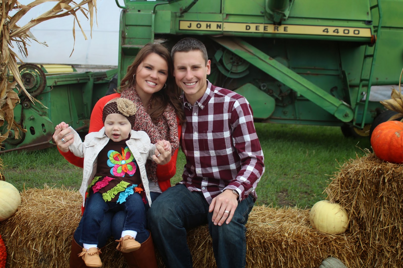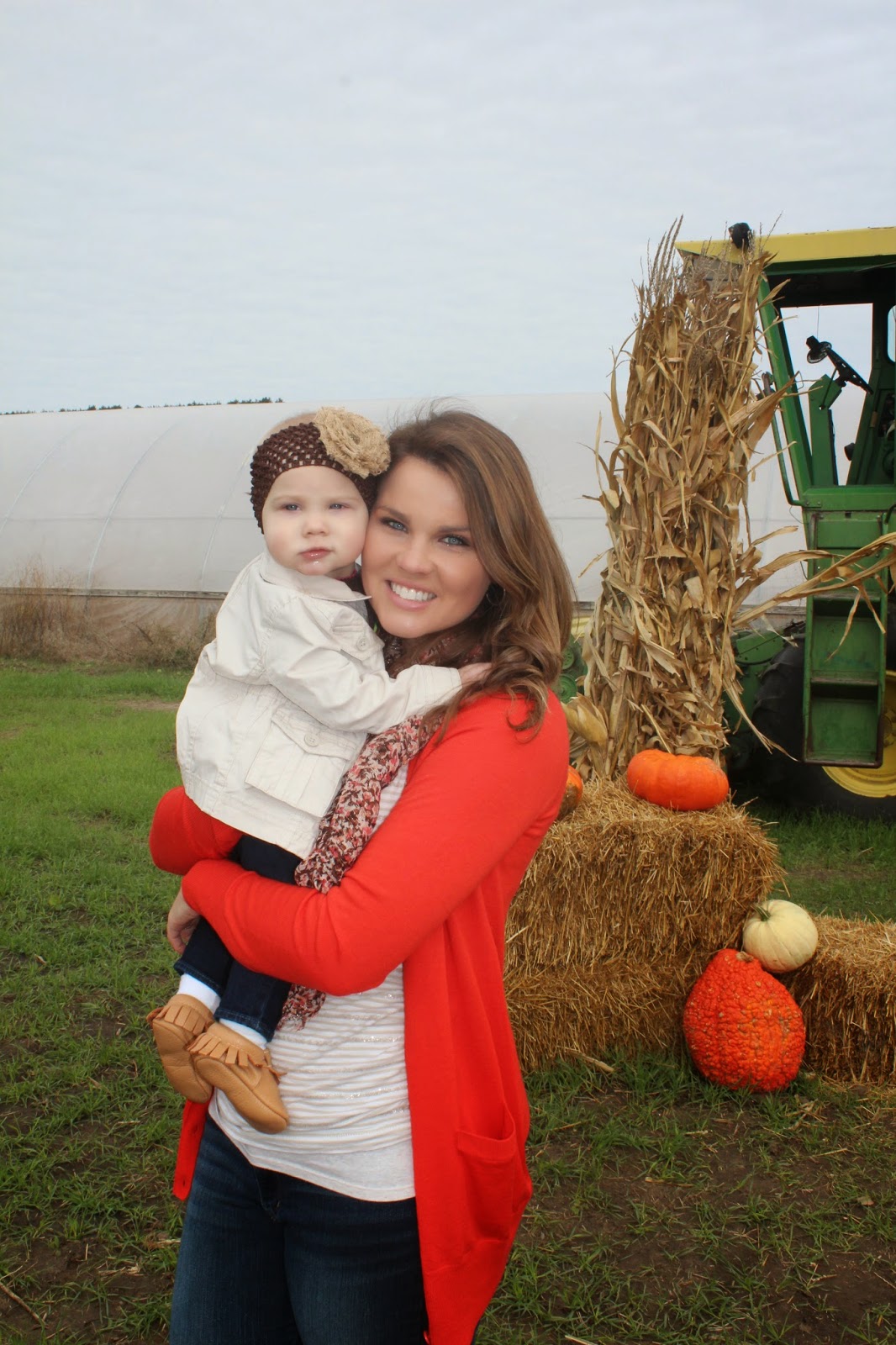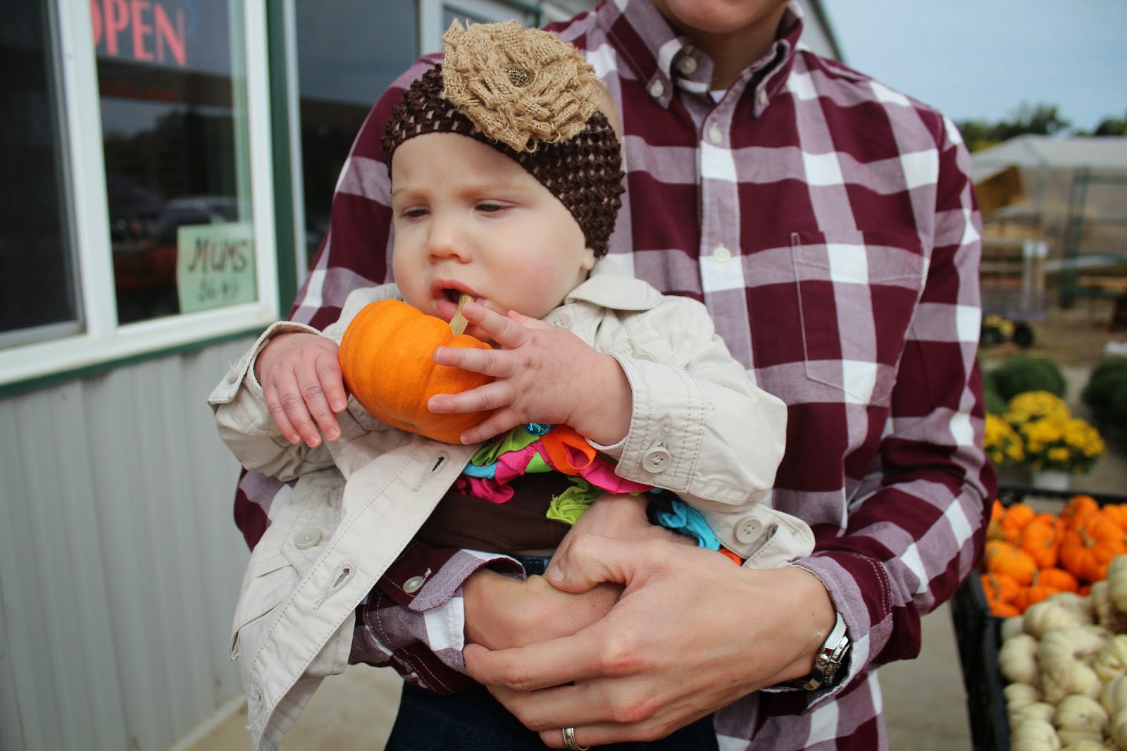 So now that we have the boring fireplace update out of the way (maybe it was helpful to somebody?), I hope you don’t mind if I show off a few pics of our fam at the pumpkin patch this weekend. We met my sister and BIL at Britt’s Farm here in Manhattan around 11 and enjoyed playing for about an hour. The wind was whippin’ so we skipped the hayride, but everything else was really fun. Going to the pumpkin patch as a kid with my family was always really fun, so I was overly excited to take Hadley.