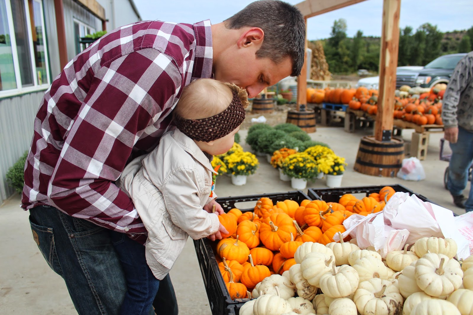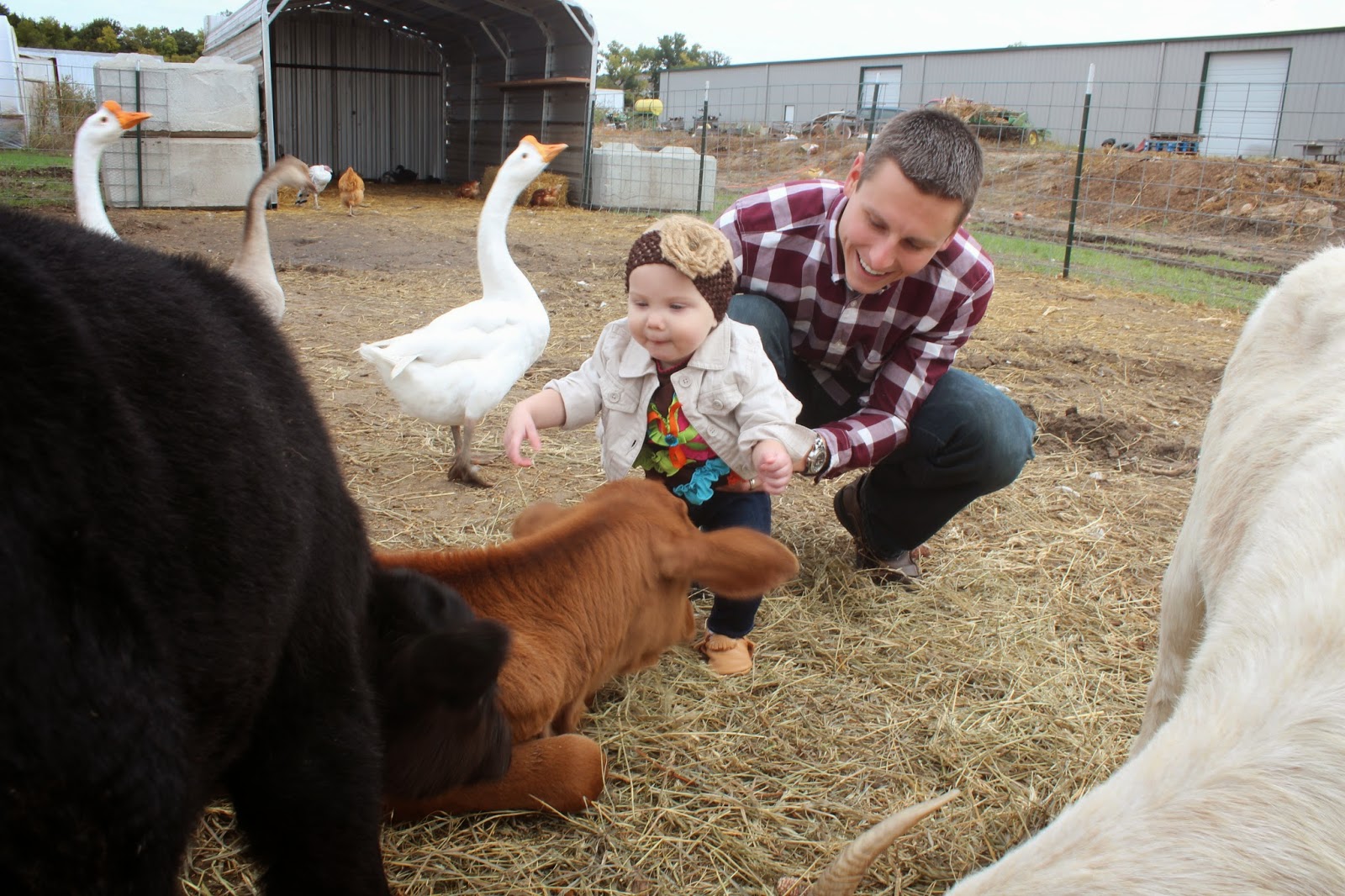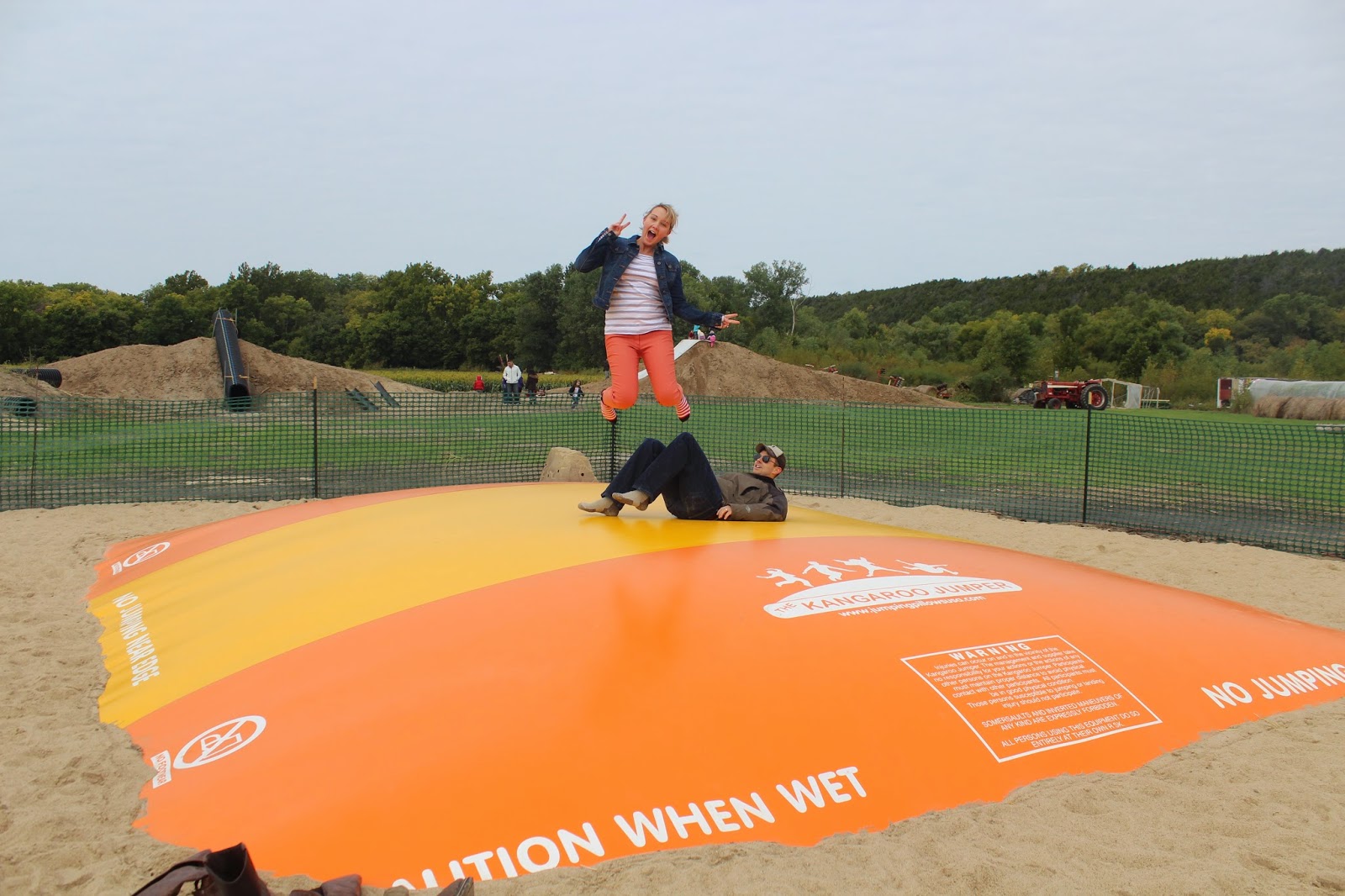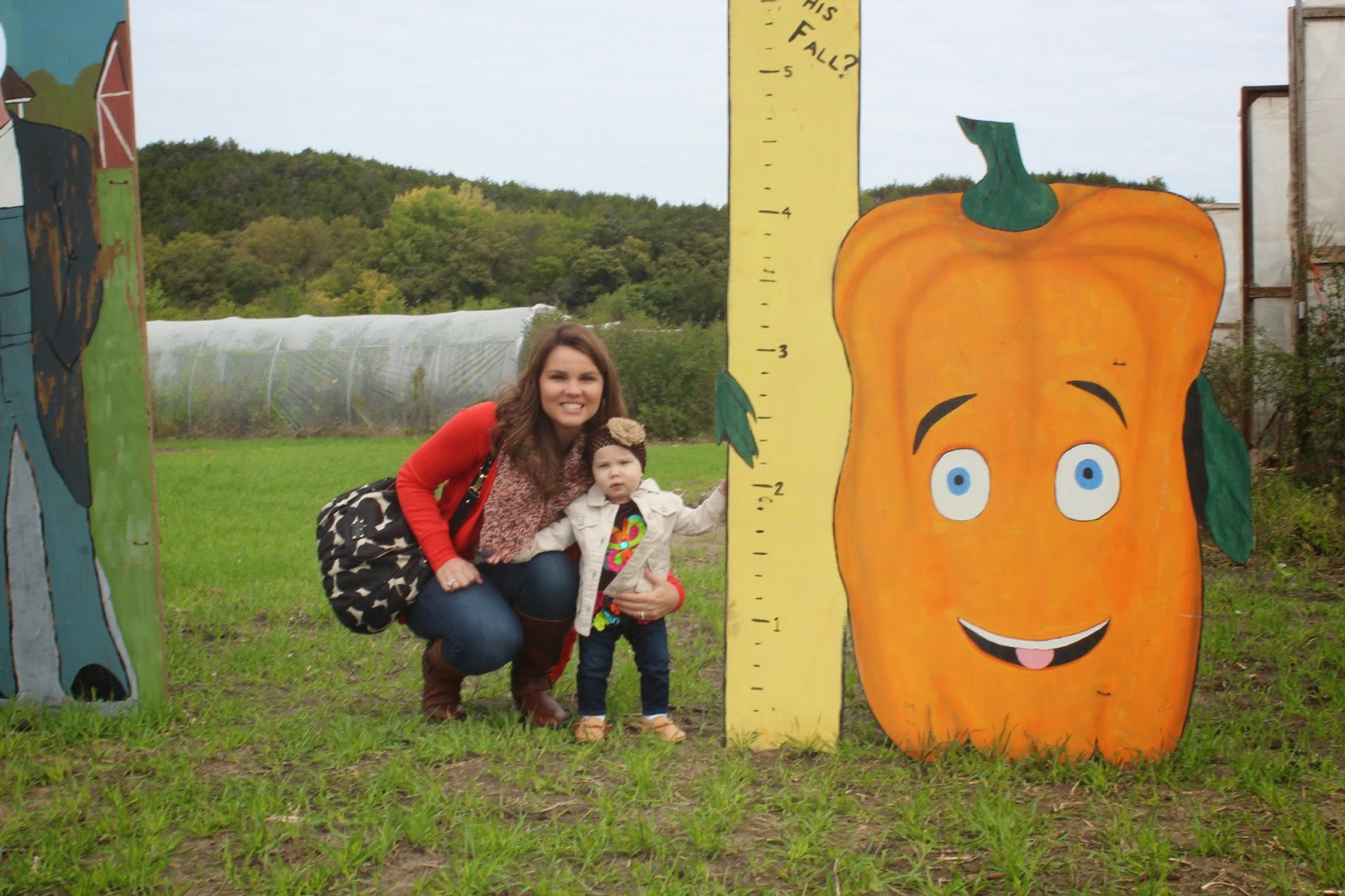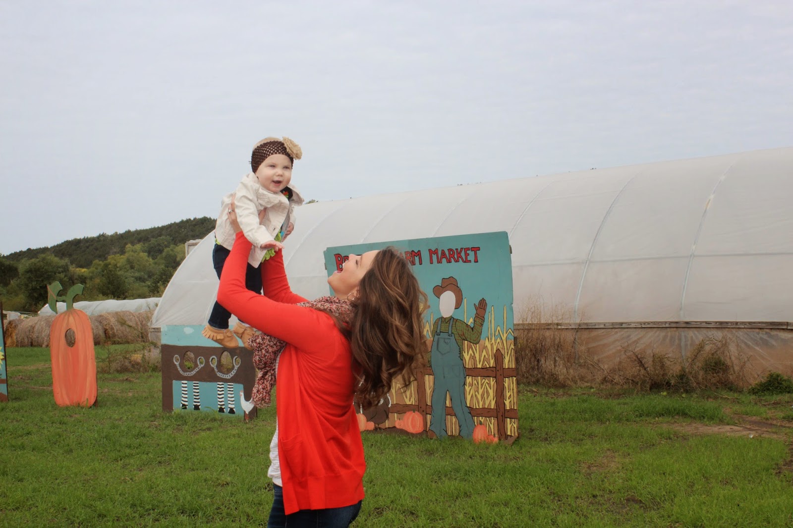 So now that we have the boring fireplace update out of the way (maybe it was helpful to somebody?), I hope you don’t mind if I show off a few pics of our fam at the pumpkin patch this weekend. We met my sister and BIL at Britt’s Farm here in Manhattan around 11 and enjoyed playing for about an hour. The wind was whippin’ so we skipped the hayride, but everything else was really fun. Going to the pumpkin patch as a kid with my family was always really fun, so I was overly excited to take Hadley.