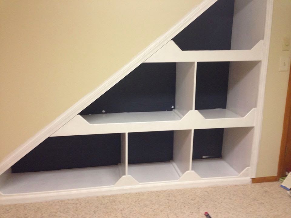 The built-in bookcase is one of my favorite features in this house because it’s so unique. I’ve been brainstorming for months how to spruce up this room, particularly the bookcase. I knew that I wanted to paint the trim white and do some kind of accent color on the back of the bookcase walls, but I didn’t have any firm ideas in mind. I finally found this inspiration picture last week and had shoes on ready to go to Home Depot to get my supplies within minutes.