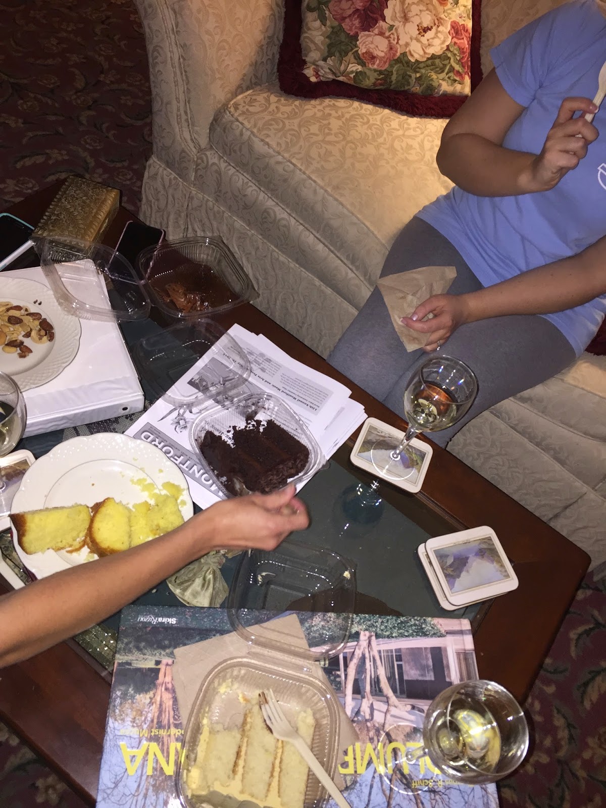 After getting settled, we freshened up and headed downtown for a bite to eat. We picked to eat at Curate because it’s the #1 restaurant on Trip Advisor, and it did not disappoint! We all enjoyed the tapas-style meal and some wine to celebrate finally being together. After dinner we passed the French Broad Chocolate Lounge on our way to our car and quickly agreed that chocolate would be the best way to end our first night of vacation! We got three desserts to go (plus we knew there was lemon pound cake back at the house – oh gosh!), drove back to the B&B, slipped into pajamas, and got comfy in the living area of the house. We laughed and told stories for what seemed like hours before making our way up to bed. Fabulous day!