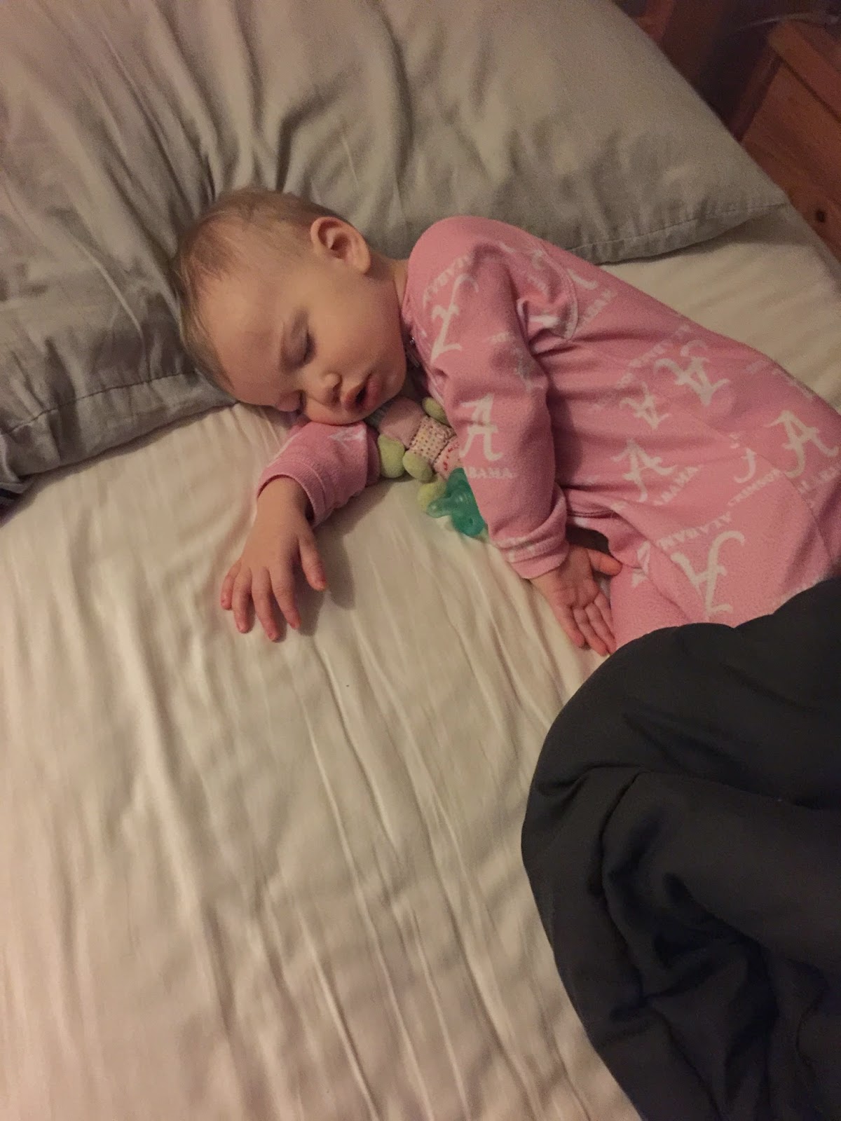 Hadley hung out in the front seat playing with my parking ticket (which I didn’t know about) while I hooked her carseat back in. Once I drove off to pay for parking, I realized my ticket had gone missing somewhere in the car and absolutely could not find it. Losing the ticket cost me about 10 extra minutes with the parking attendant, but by 8 p.m. we were on the road back to Alabama. I’d picked Hadley up some milk in the airport for her bottle, so she drank that in her carseat and then slept the whole two hour drive.