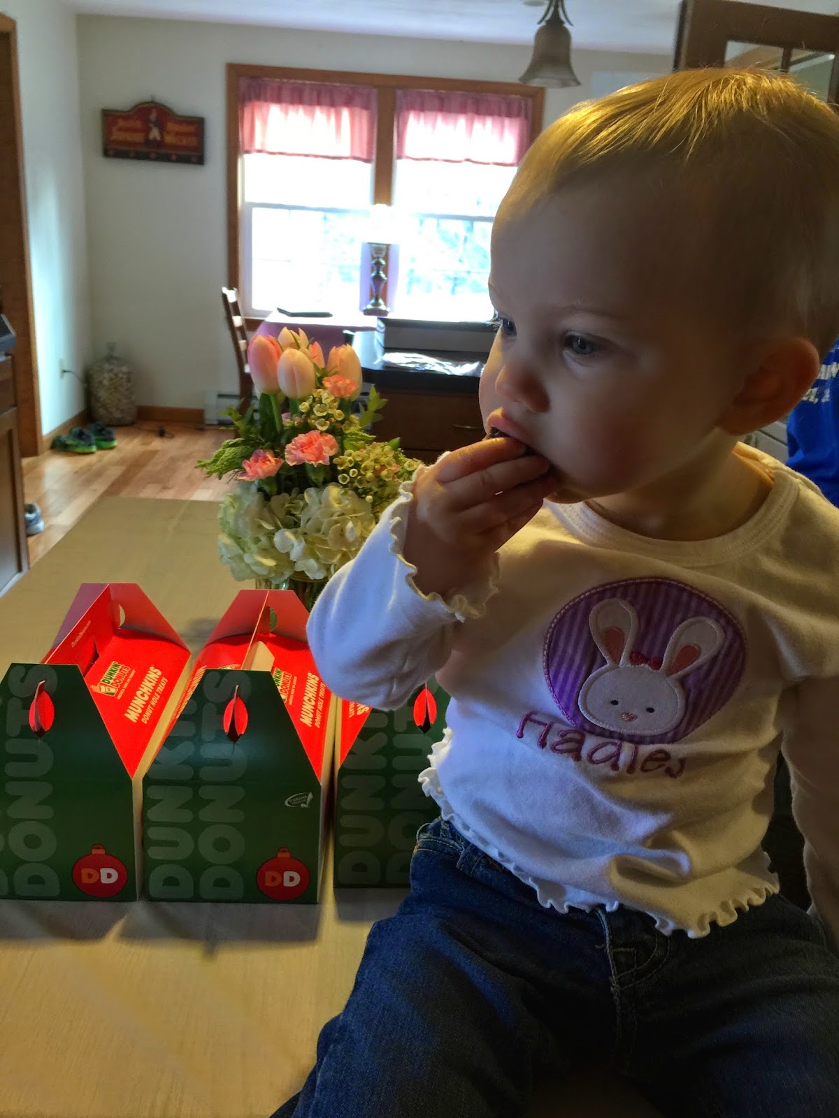 Jessica’s sweet dad offered Hadley a chocolate munchkin doughnut hole, and she ate it in two bites. She couldn’t leave New England without trying Dunkin Donuts. 😉