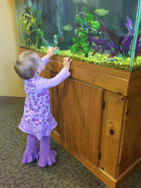 We were once again at the doctor a couple weeks ago because she’d been pulling at her ears for three days, so we assumed she was experiencing her second ear infection. We were wrong and she was just fine. Pictured below is her favorite part of doctor visits – the fish tank!