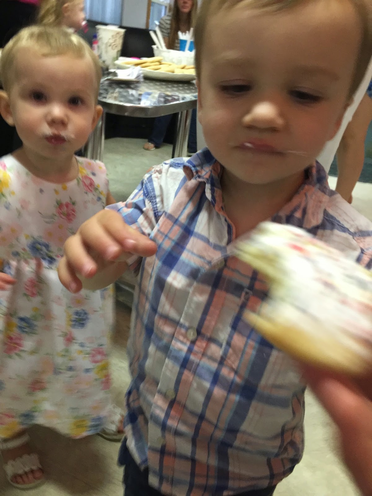 Not only did our church have this cute little photo booth, but the youth group had a cookie making station for all the littles to make cookies with their moms. Hadley and Jack loved it! I love their little icing-covered faces.