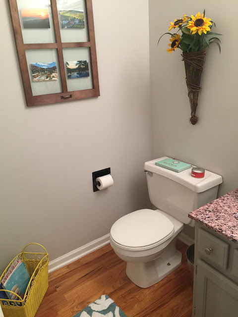 During nap time a few days later I rummaged through my spray paint collection and thought that a pop of yellow would be a fun edition to the bathroom. I love Rust-Oleum spray paints!