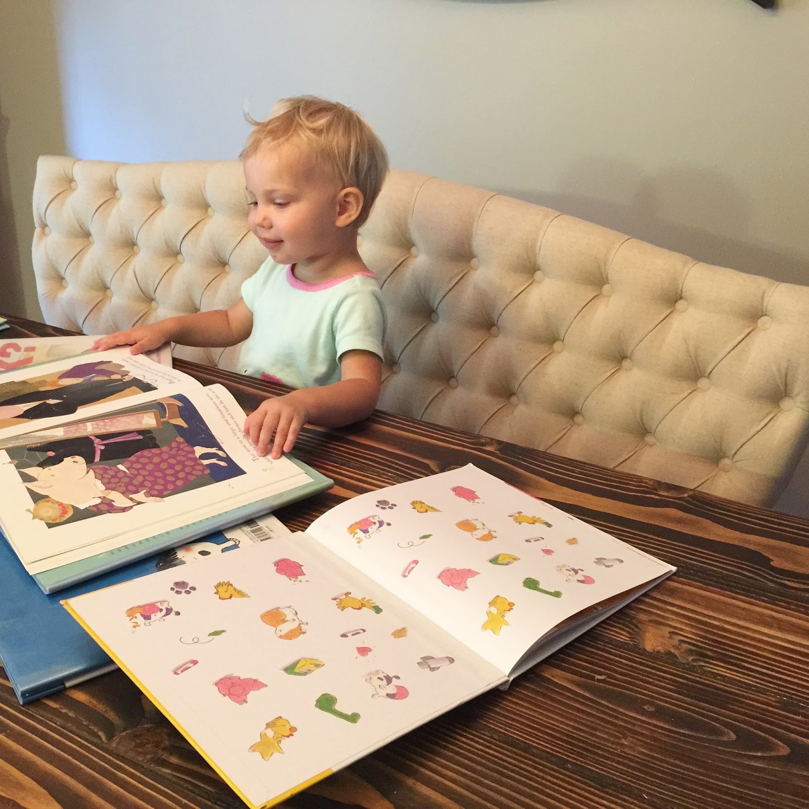 Though she has a zillion books all over the house, the only books that are staying on the kitchen table are her library books we’ve been picking up each week. She loves climbing on the bench to browse through them, and we love having them separated from her other books and “safe” from toddler harm on the table.