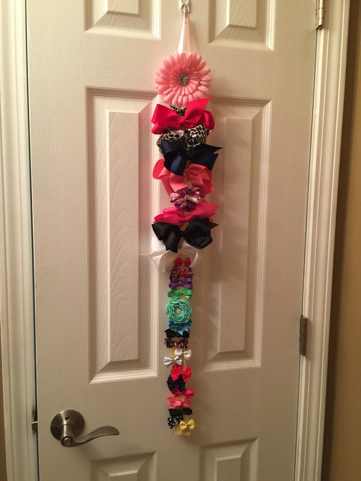 After two years of storing Hadley’s bows in a bin, I finally got around to making her a bow holder! I’ve seen a ton of them for sale around town for $10-$20, but I knew that I could make one for free with materials I already had at home in my craft bin. Two long strands of ribbon, a couple sticks of hot glue, and 10 minutes later this thing was ready to hang!