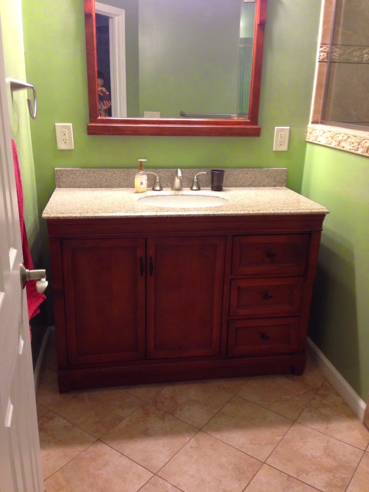 Four hours later we were back at my sister’s so that Hadley could sleep for the afternoon. Jamie stayed with her while I went back to our house to finish the bathroom. I’ve only painted two rooms in my life (and did a terrible job both times), but I was determined to do better! I got a little out of the lines, but some white touch-up paint did the trick! 😉 Now I think it looks great!