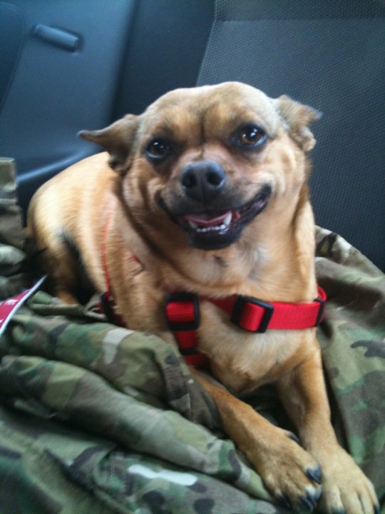 So while his poor (angry) mama stood outside the running car on the side of the road with my picked-up garage sale sign in hand, he put his little paws up on the dash with a look that was all “Why are you not getting in the car, Mom?”