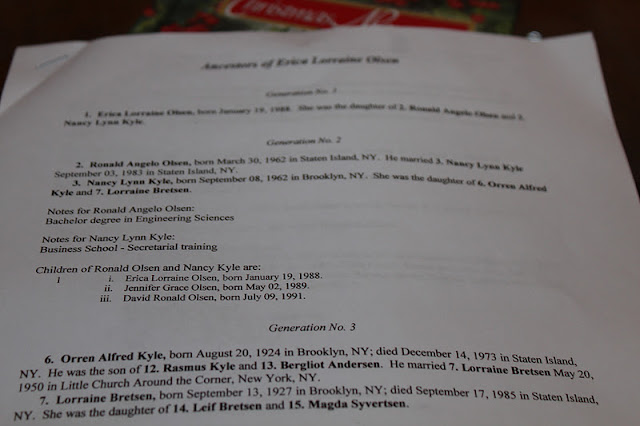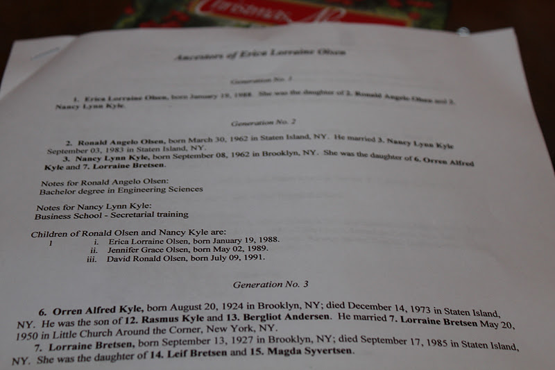 It’s a 12-page document of my entire matural family history. Unbelivable. It’s extremely detailed and lists back to my great x 10 grandfather. I’ve always known that I’m Norweigan, but it’s so fascinating to read about who lived where and when everybody started making the trek from Norway to New York. I pieced through it while Jamie was out Christmas shopping, and I was so excited to show him when he got home. He was equally intrigued and suggested we make an actual “tree” of everyone so that we can visually see everything better.