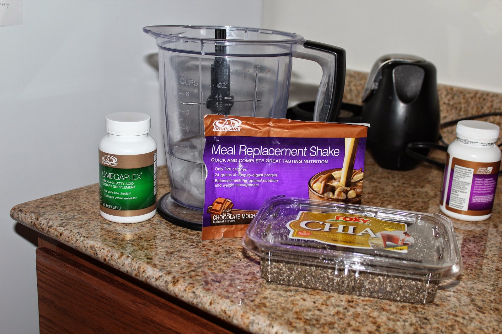 For breakfast I had a chocolate mocha shake mixed up in my Ninja blender with ice cubes and water. I also threw in a spoonful of chia seeds since they are so stinkin’ good for you. Two OmegaPlex pills (essentially fish oil) finished up breakfast!